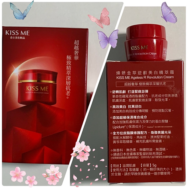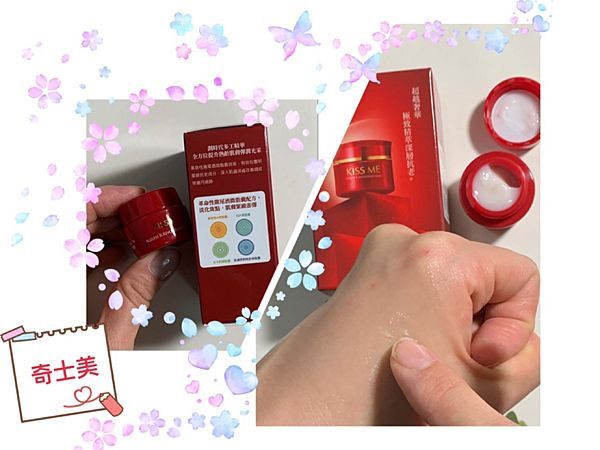 膜女負江開心拿到櫃姐贈送的奇士美KISSME煥妍金萃逆齡美白精萃霜,正常版50g、試用品5g,小小一罐的試用品簡直是迷你版,很可愛的縮小版。
