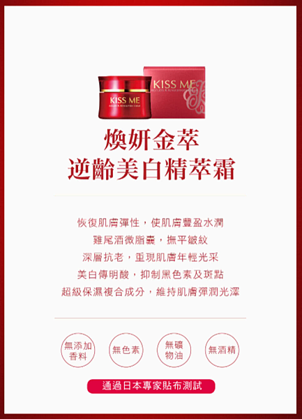 奇士美KISSME煥妍金萃逆齡美白系列重現肌膚原生彈力,逆齡抗老再進化,劃時代「多工精華」,3重革命,全面提升肌膚光采。