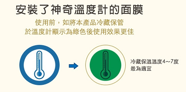 一盒五片單片面膜包裝,一樣是安瓶造型,包裝袋上有一個藍色圓圈的溫度計標示,膜女負江第一次看到面膜上面有溫度計,夏天時把面膜放到冰箱冷藏後,溫度計會顯示為綠色,使用效果會更佳,如果有興趣的水水們可以試試看唷~