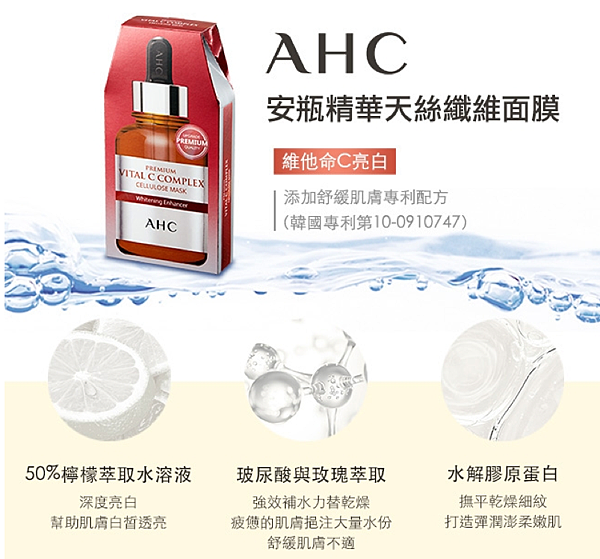「AHC安瓶精華天絲纖維維他命C亮白面膜」添加舒緩肌膚專利配方,蘊含整瓶保濕安瓶原液,使肌膚持久水潤,滑嫩一整天。